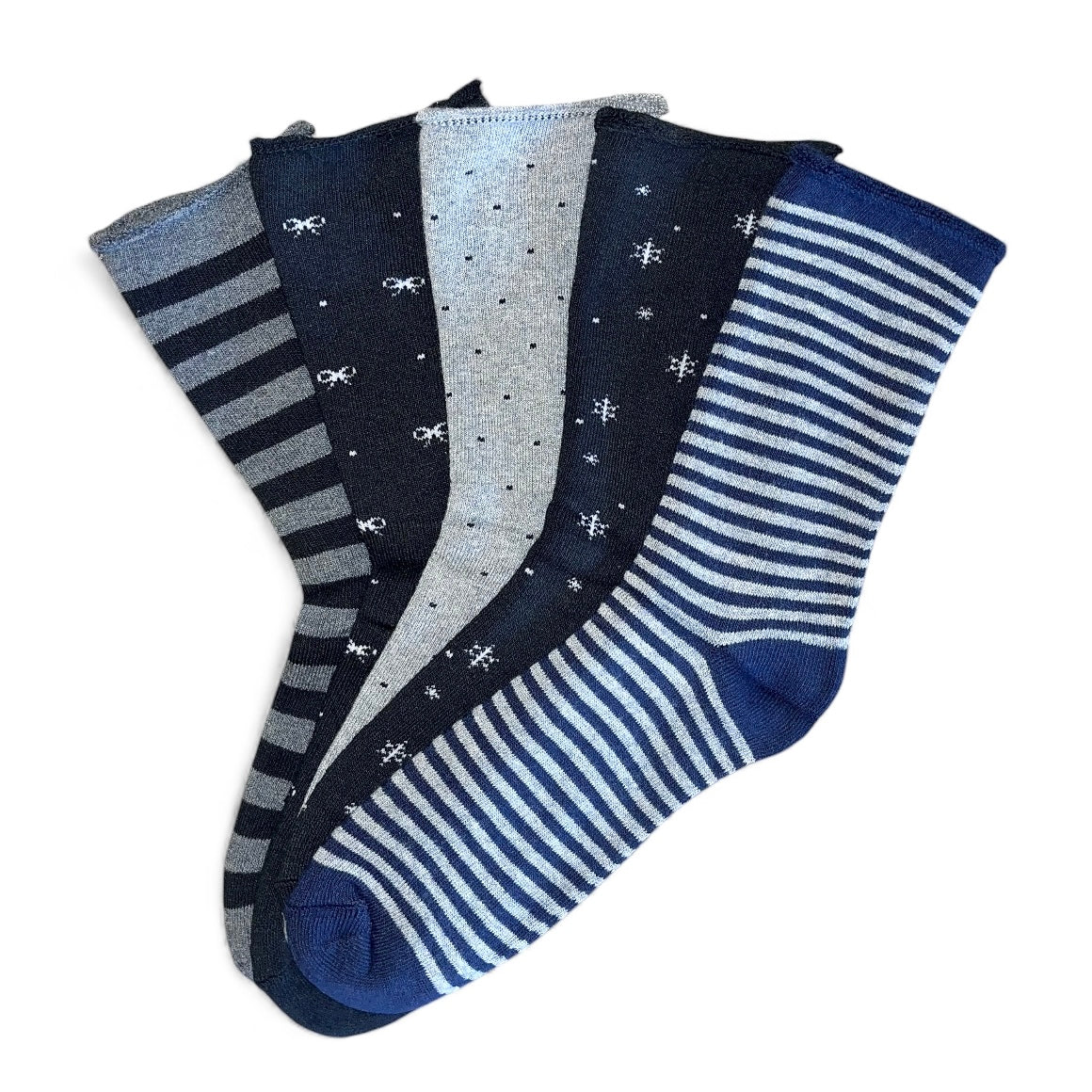 5 pár vastag termo női zokni gumi nélkül, sötét, különféle minták 5821